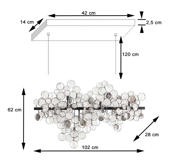 Material: Stomme och takfäste i pulverlackat svart stål, prismor i färgat glas. Kabel i transparent plast. Egenmontering. Prismor monteras i ringarna.