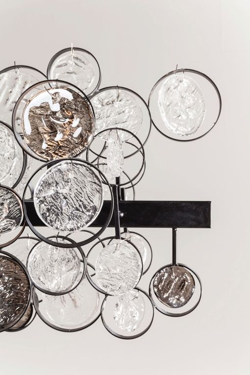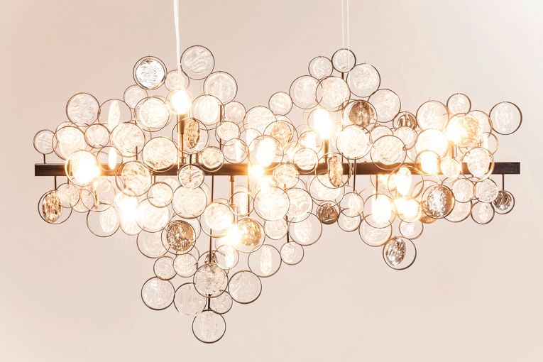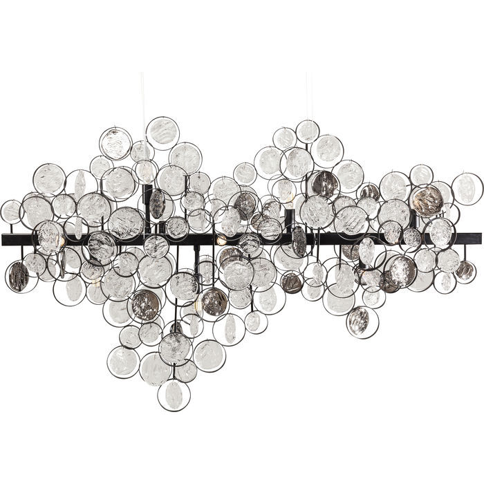 Taklampa Glasmoln - en unik taklampa och modern variant av takkrona. Lampan är som en juvel över matbordet eller bardisken med 161 små glasstenar i olika storlek och nyans uppbyggda som en konstnärlig skulptur. En fantastiskt vacker pendel med poetisk charm. De runda prismorna i av färgat glas är inspirerade av moln och är omsorgsfullt handgjorda. Oavsett om den är tänd eller släckt så är denna majestätiska pendellampa en fascinerande ljusskulptur.
