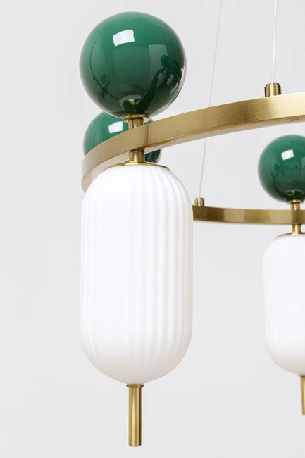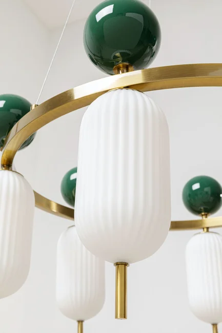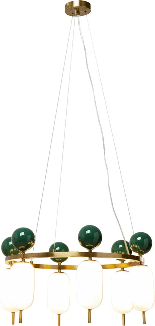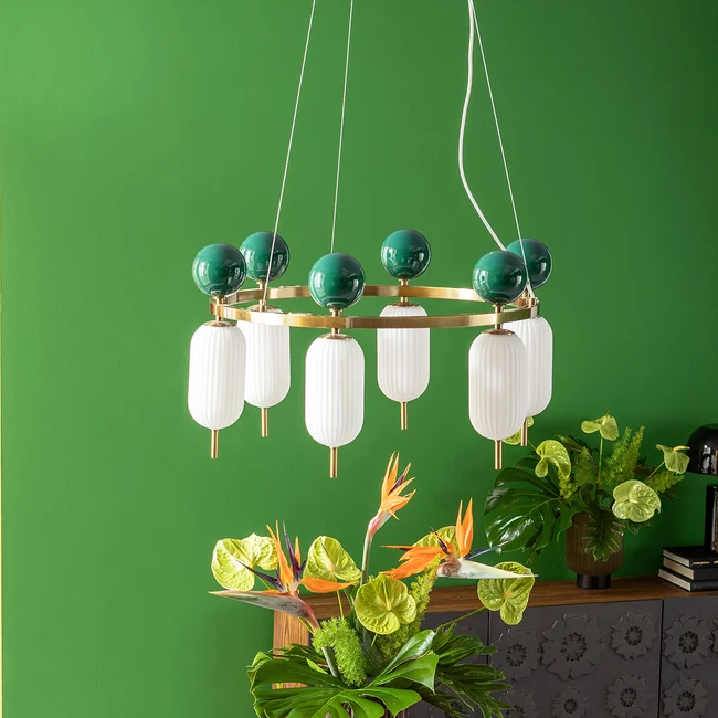 Pendellampan Modern Retro är ett särskilt elegant och modernt tillskott till din interiör. Med sina sex kreativt formade glaskupor, de gröna sfärerna ovanför och den gyllene, titanbelagda metallringen sätter den en unik höjdpunkt i rummet. En mångsidig belysning som är höj- och sänkbar. Dess moderna och unika design gör den till ett riktigt blickfång för matsalen, vardagsrummet eller hallen. Pendellampan levereras monterad och är redo för omedelbar användning.