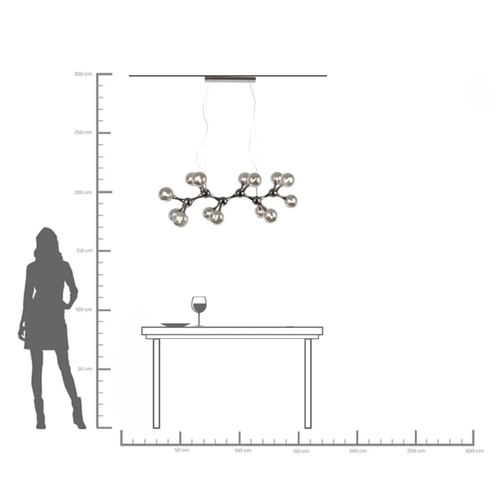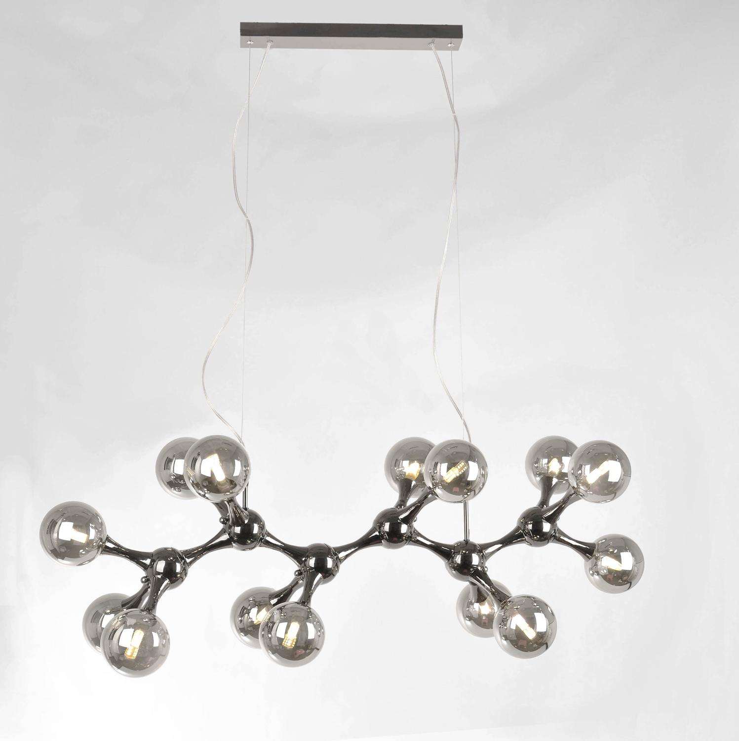 Linjär taklampa med rökfärgade glaskupor och svart metallstomme. 14x G9-socklar ger sprakande men jämnt ljus över matbordet.