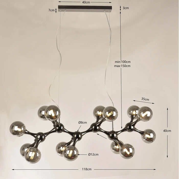 En skulptural taklampa där röktonade glaskupor omger en slank metallram och skapar ett modernt, grafiskt uttryck. Med 14 ljuskällor ger lampan generöst och jämnt ljus över middagsbordet, köksön eller i vardagsrummet. Den höjdjusterbara upphängningen gör det enkelt att anpassa belysningen till rummet.