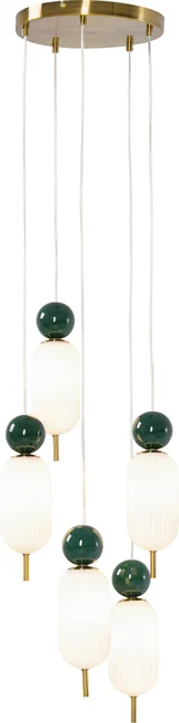 Pendellampan Modern Retro med vitt räfflat glas och gröna sfärer ger subtil elegans till rummet. Med sitt färgade glas och titanbelagda stål-tak är den inte bara iögonfallande utan är även praktiskt höj- och sänkbar. Den tidlösa designen hos denna lampa passar perfekt med alla stilfulla interiörer och är det perfekta valet för alla som letar efter en stilren belysning som är både praktisk och estetiskt tilltalande. 230 V, 50/60 Hz, glödlampsbeslag G9, antal ljuskällor 5, max. 40 watt, utan ljuskälla, utbytbar ljuskälla