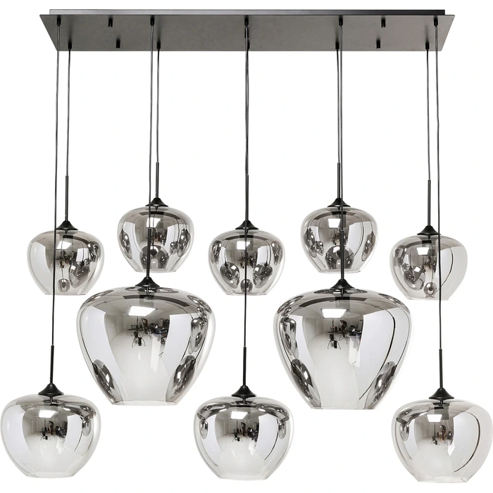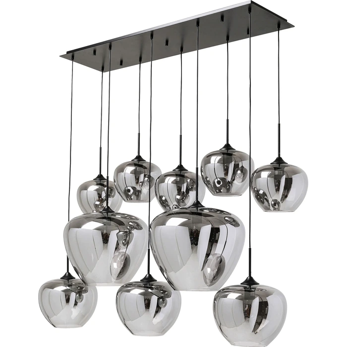 En imponerande pendellampa med tio rökfärgade glasklot i olika storlekar som ger djup och mjukt, behagligt sken. Den höjdjusterbara upphängningen gör den enkel att anpassa över matbordet eller i rum med hög takhöjd.