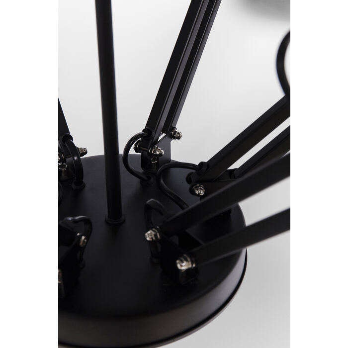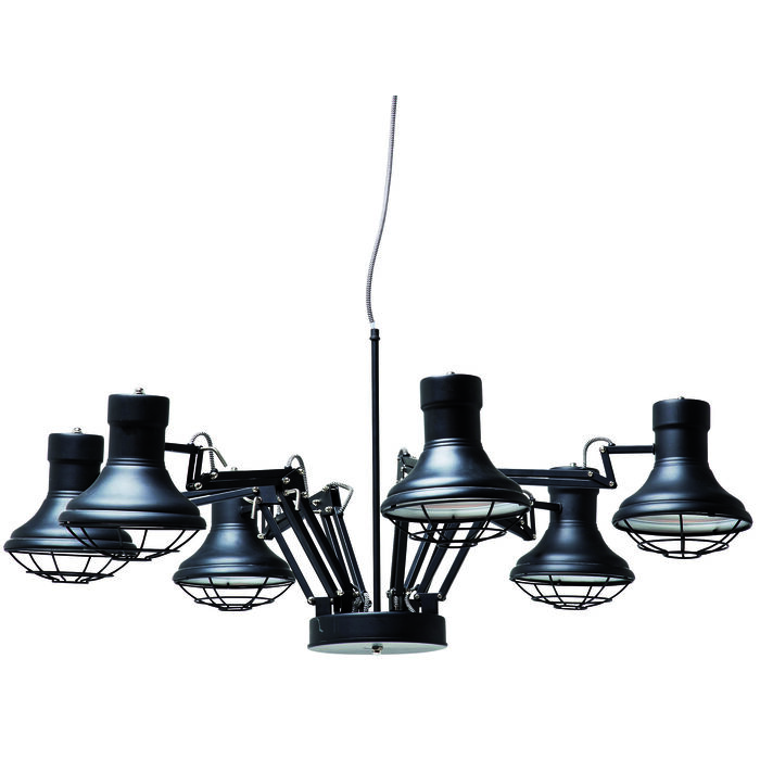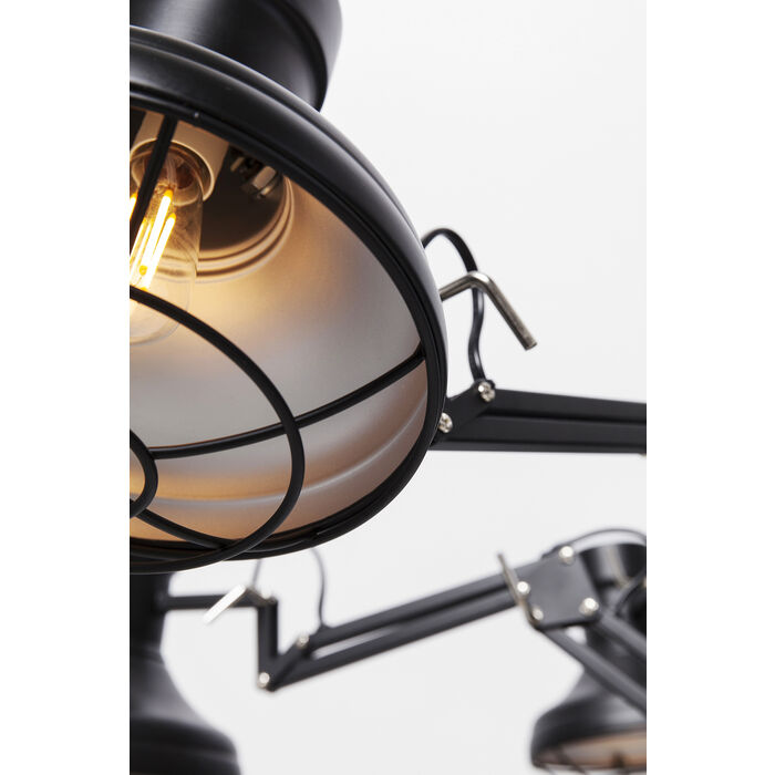Med sina 6 stycken spottar är spindellampan ett lysande exempel på flexibilitet och funktionell design. Spottarna kan justeras olika, vilket gör att individuella ljusscenarier kan skapas. På så sätt kan vissa områden i ett rum belysas och visas som bäst. Metall-looken med sin svarta färg ger en modern touch och – i kombination med lampskärmarnas svängda form – avrundar lampans övergripande elegans.