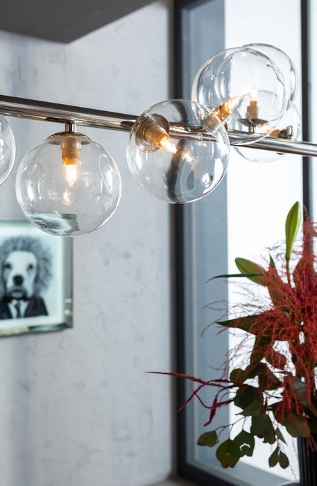 En minimalistisk, stilren taklampa med flera glaskupor som slingrar sig längs en kromad stav i tunn, smäcker design. Lägg märke även till den strama eleganta hängningen där kabeln är inkapslad i det kromade röret. Lampan har 14 st. lampkupor i klarglas för små LED-lampor med G9 fattning. Diskret takkåpa i kromad silverfinish. Taklampan finns även i mässing med svagt guldtonade kupor samt i svart med svagt gråtonade kupor.