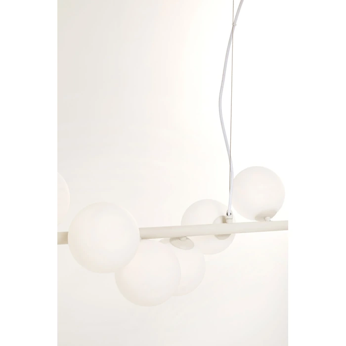 Grafisk pendel i greige med mjölkglas-kupor som svävar som små molekyler runt den slanka stommen. Resultatet är ett jämnt, behagligt ljus över matbord, köksö eller entré – en armatur som förenar skulptural form med vardagsfunktion. Med sex utbytbara ljuskällor kan du finjustera ljusbild och färgtemperatur efter behov, från varmt umgängesljus till klarare arbetsbelysning.