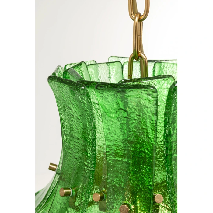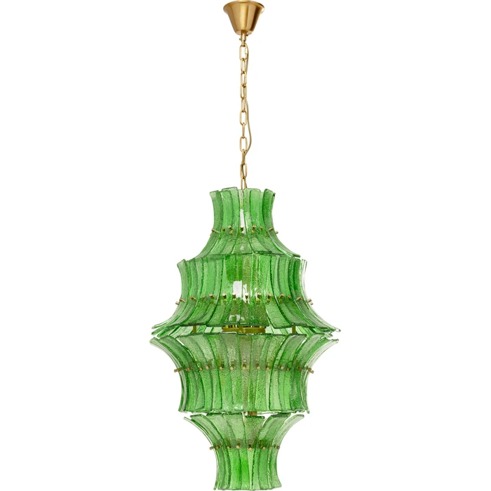 Designen består av flera lager av böljande glaselement i grön ton som ger lampan en skulptural och konstnärlig karaktär. Det lackerade glaset i kombination med detaljer i borstad metall skapar ett modernt men samtidigt tidlöst uttryck. Ljuset filtreras mjukt genom glaset och ger ett varmt och behagligt sken som passar i både eleganta och moderna inredningsstilar.