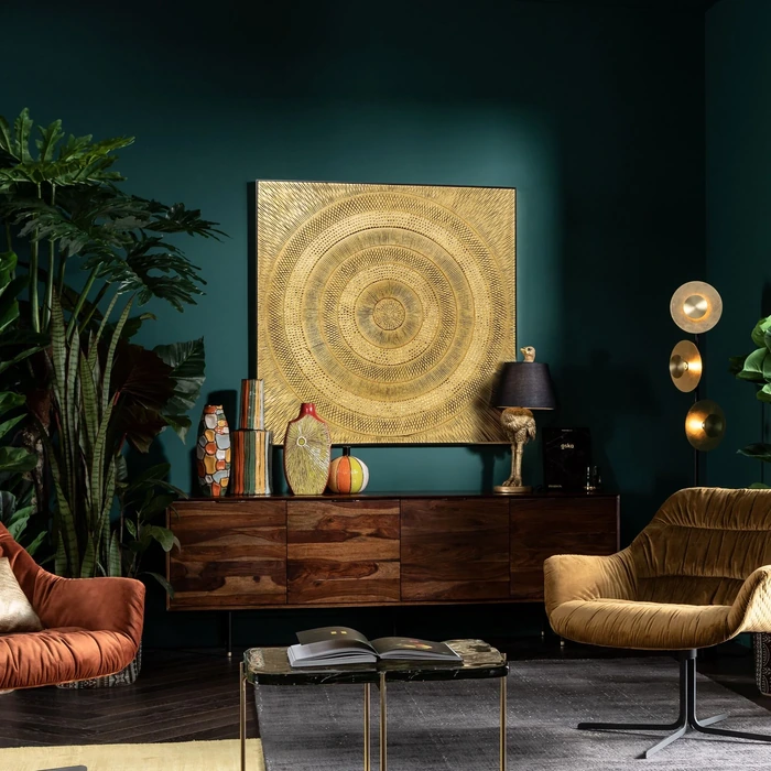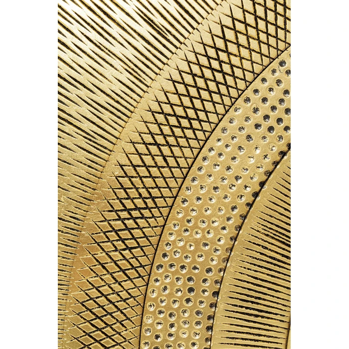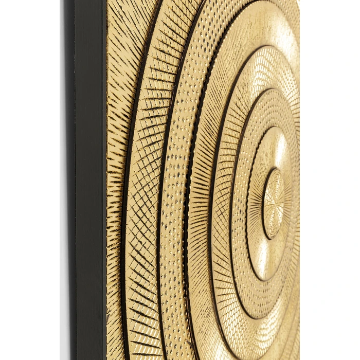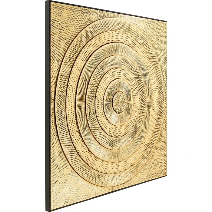 Tavla Art Circle Gold 120x120 cm är en exklusiv väggdekoration i guld som kombinerar konstnärlig design med en lyxig känsla. Den stora kvadratiska tavlan fungerar som ett kraftfullt blickfång och passar perfekt ovanför soffan, sängen eller som centerpiece i vardagsrummet. Den gyllene ytan reflekterar ljus och skapar en varm och elegant atmosfär.Designen kännetecknas av handgjorda, snidade mönster som ger tavlan ett levande och tredimensionellt uttryck. Kombinationen av MDF och en ram i massivt trä ger stabilitet och kvalitet, samtidigt som den antikguldiga finishen tillför djup och exklusivitet. Varje tavla är unik tack vare det hantverksmässiga arbetet, vilket gör den till en personlig inredningsdetalj.