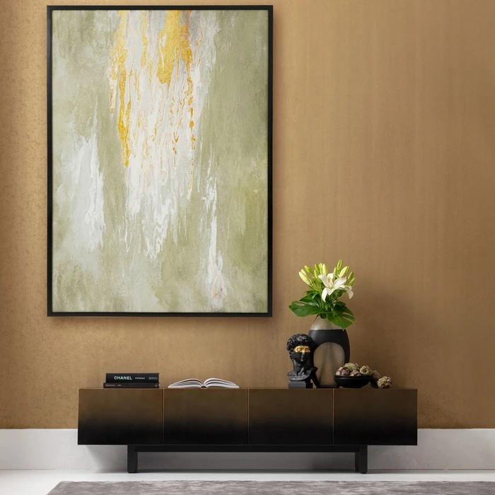 Tavla Artistas Grön är ett uttrycksfullt konstverk som kombinerar mjuka gröna nyanser med subtila gyllene detaljer. Den stora storleken, 120 × 180 cm, skapar en imponerande visuell närvaro som förvandlar både små och stora rum. Det abstrakta motivet har ett harmoniskt flöde som bidrar till lugn, samtidigt som färgernas dynamik ger energi och karaktär.