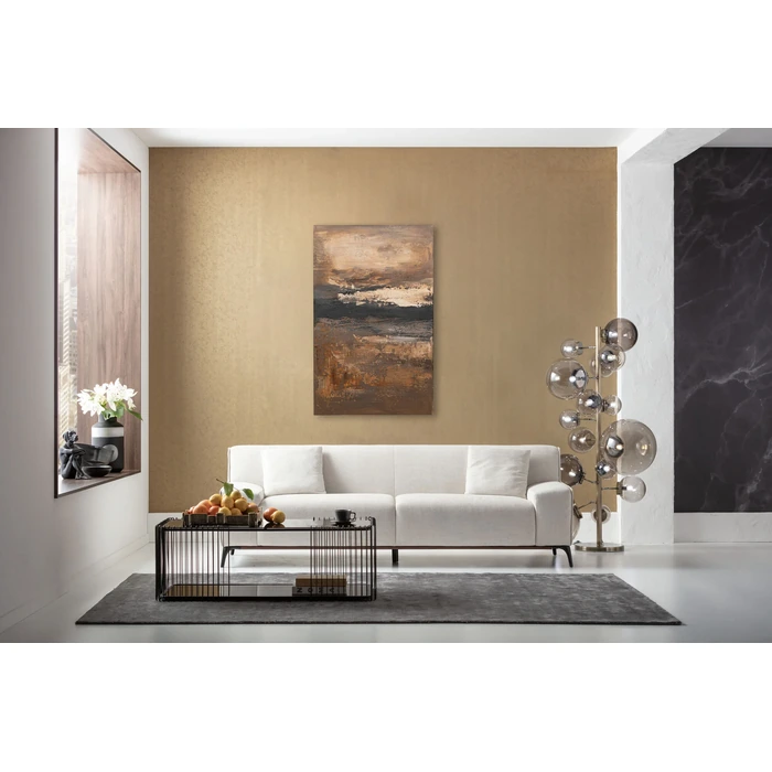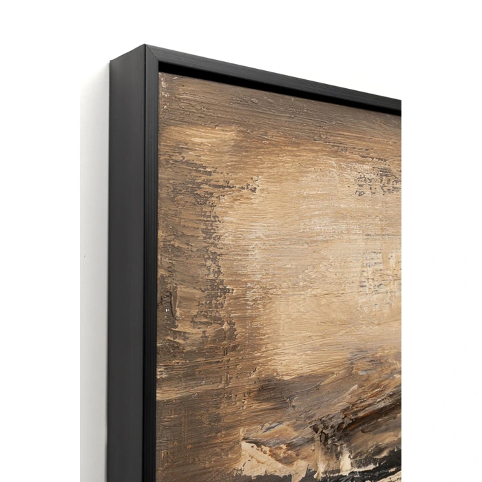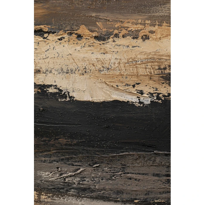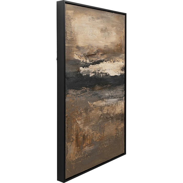 Tavla Dusty Horizon är en stor, handmålad canvas som för in djup och värme i rummet. De jordiga tonerna av beige, brun, rost och svart blandas i kraftfulla penseldrag och skiktad struktur, vilket skapar en abstrakt horisont som för tankarna till dimmiga landskap och väderbitna berg. Den generösa storleken gör att tavlan direkt blir rummets fokuspunkt, oavsett om den hängs över soffa, matbord eller sänggavel.
