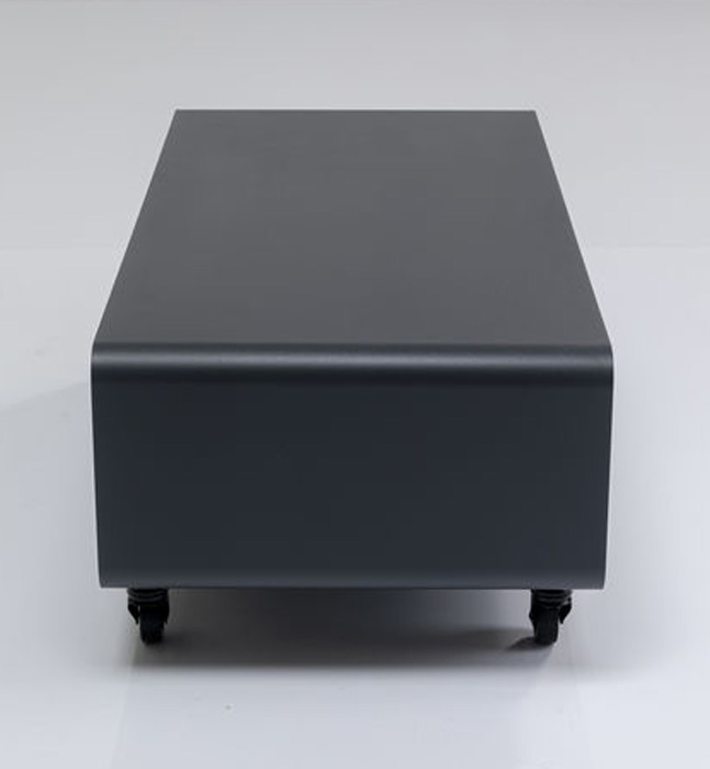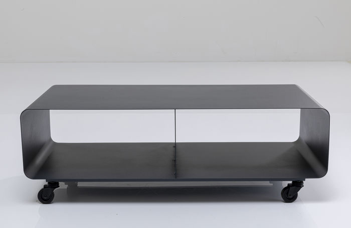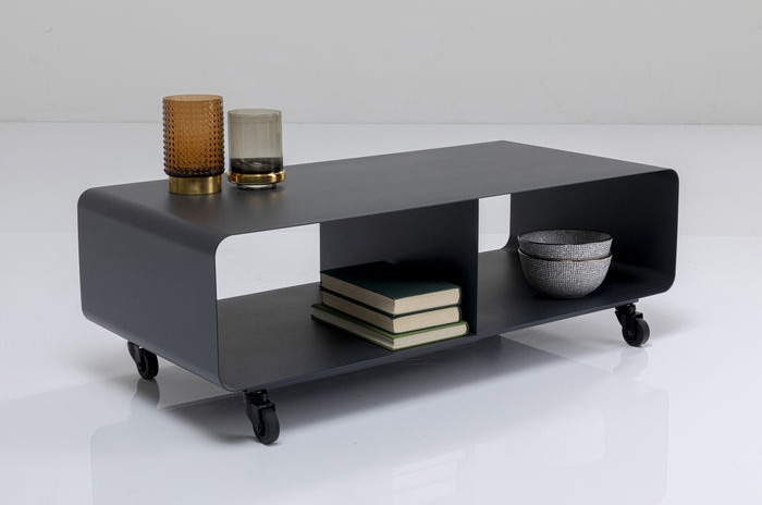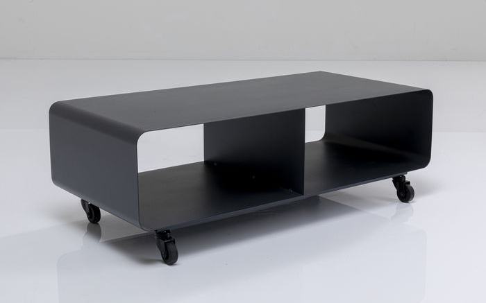 Nätt och stilren tv-bänk på hjul. Tv-bänk och förvaringsmöbel på hjul i stilren, strömlinjeformad design som ger en cool retro 70-tals känsla. Tv-bänken är tillverkad i tunt lackat stål i mörk grafitgrå nyans som framhäver den rena formen. Den låga skänken är både modern och tidlös och ger dig tillräckligt med utrymme för all din tekniska utrustning. Det innebär att alla komponenter ligger nära varandra och prydligt förvarade på samma plats. Tv-möbeln är lätt att flytta runt tack vare sina fyra praktiska hjul och passar i alla inredningsstilar med sin mjuka form och stilrena, grå färg.