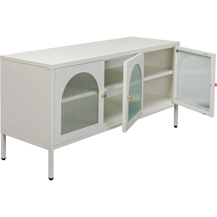 Vit TV-bänk med räfflat glas och eleganta gulddetaljer i medelhavsstil.