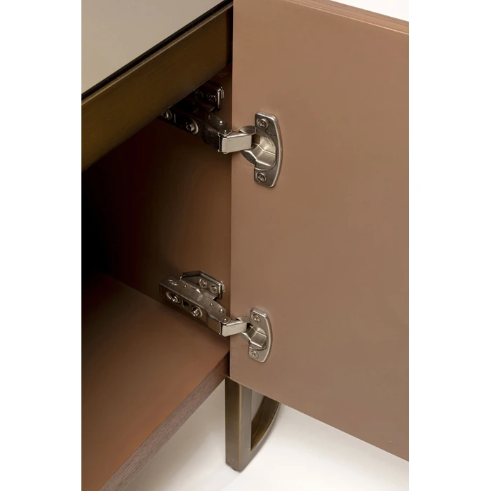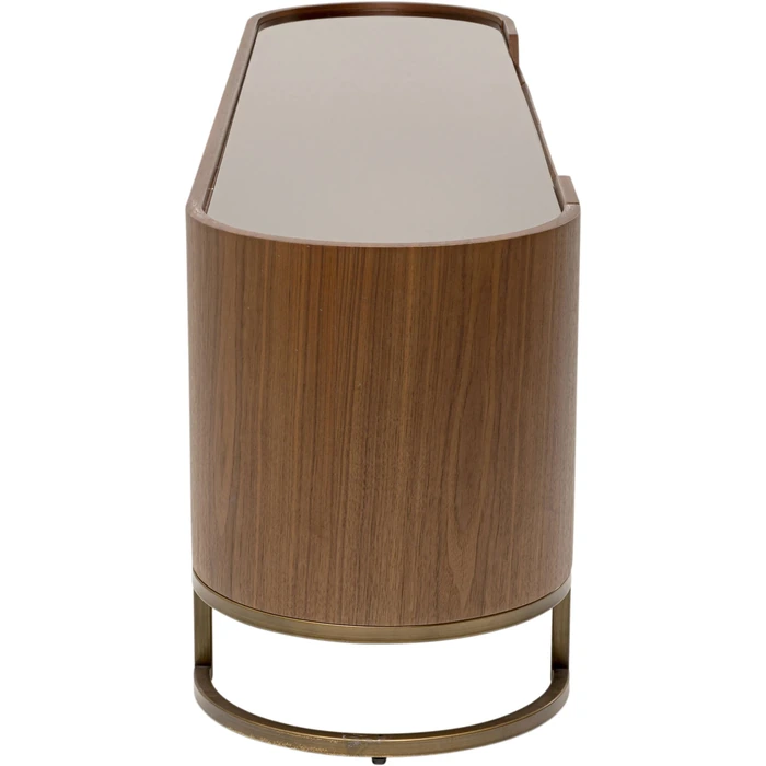 Denna möbel kombinerar hantverk i hög kvalitet med en stilren design. Den är tillverkad i vacker valnötsfanér med naturligt ådrad yta och toppad med mörkt spegelglas som tillför en elegant glans. De rundade hörnen och det unika underredet i lackat rostfritt stål skapar ett lätt och exklusivt uttryck. Bakom de två dörrarna och i de två rymliga lådorna finns gott om plats för medieutrustning, böcker eller dekorationer. Passar perfekt som tv-bänk eller förvaringslösning i det moderna vardagsrummet.