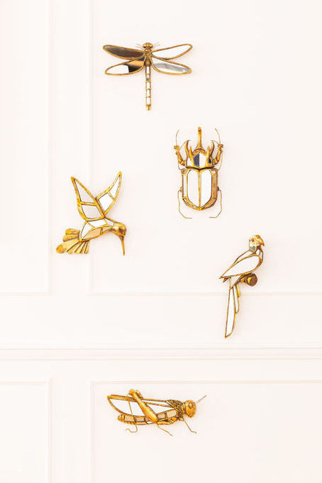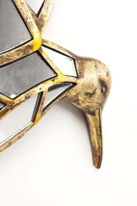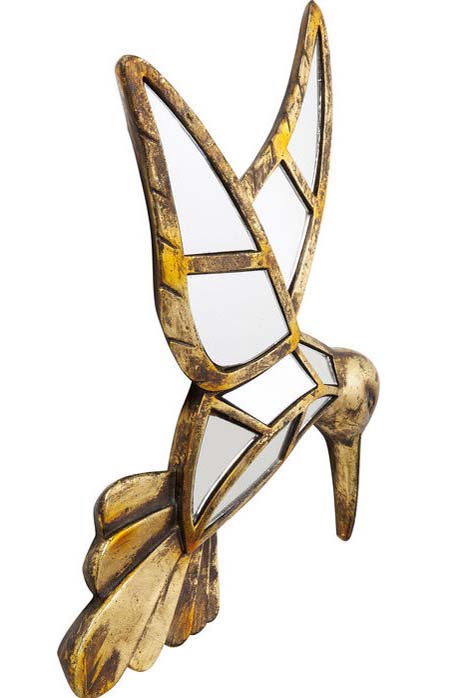En ovanlig och vacker väggdekoration i form av en kolibri i guld med infällda speglar som återspeglar rummet och ljuset. Mycket effektfull inredningsdetalj som passar i alla rum - på en tavelvägg, ovanför en säng, i badrummet, en fönsternisch m.m. Dekoren är tillverkad för hand.