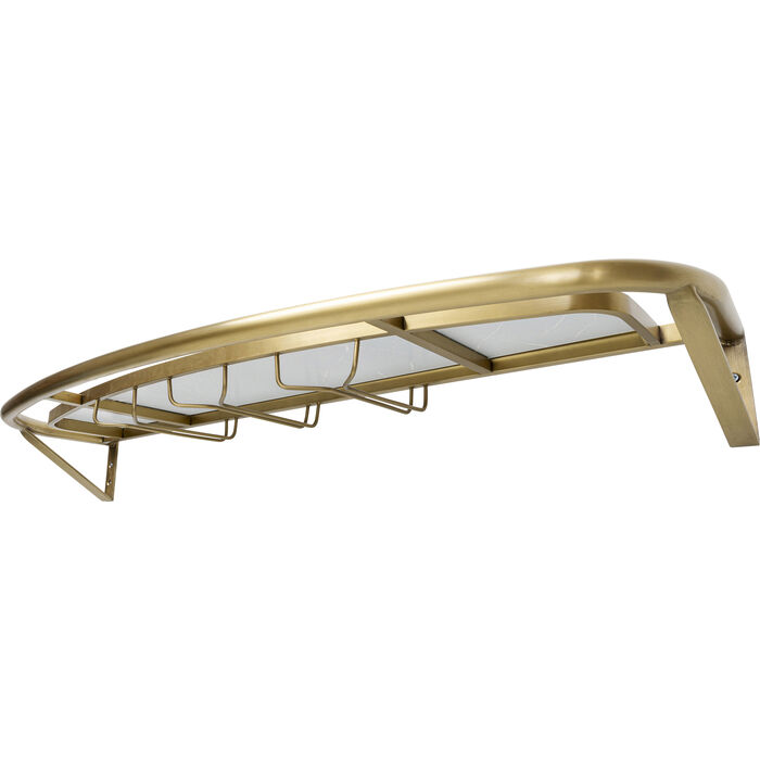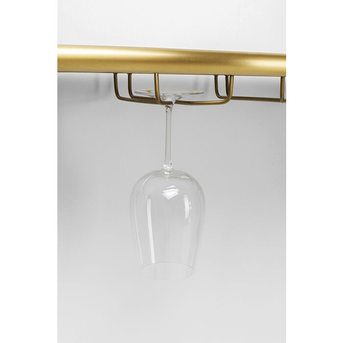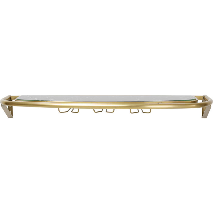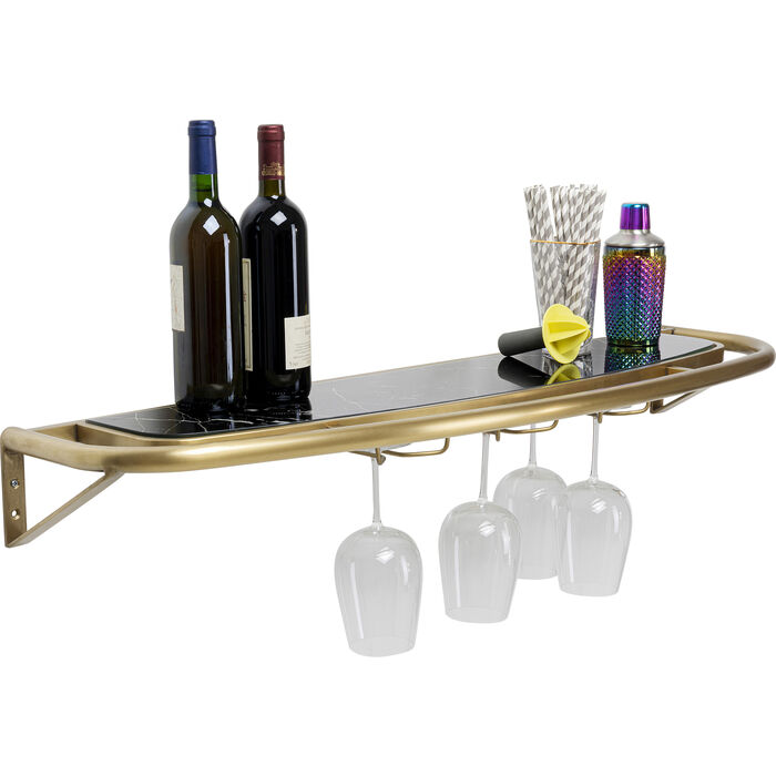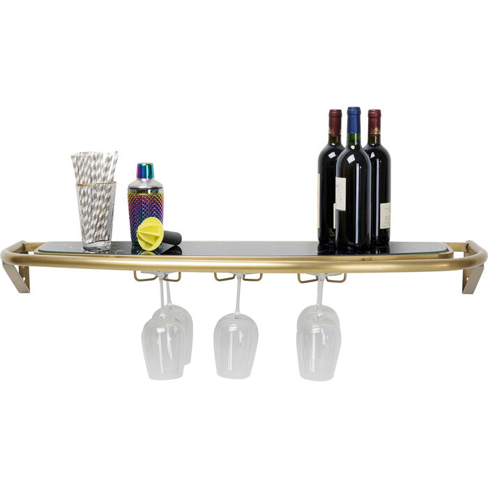 En läcker vägghylla i italiensk stil med färgerna guld och svart. Glasskivan har laminerat glas i marmor-look. Vägghyllan Veneto har även ställ för att hänga vinglas under hyllan.
