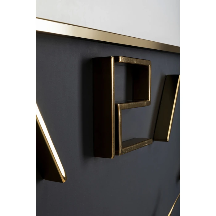 Material: Front: MDF lackerad, ram: rostfritt stål (titanbelagt), siffror & visare: aluminium (mässingspläterad)