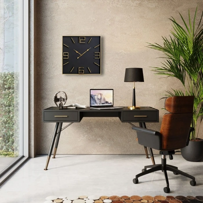 Stilren väggklocka i svart med guldfinish som blir ett statement på väggen – perfekt för hall, vardagsrum eller kontor.