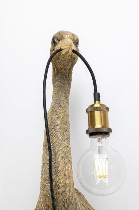 En härlig och humoristisk vägglampa i form av en häger som håller en lampsladd i näbben. Lampan har en fin matt guldfinish och välgjorda detaljer med textilklädd svart kabel och lampfäste i klassisk design. Lampan är en riktig eye-catcher som gör livet, eller i alla fall inredningen betydligt roligare - som annorlunda sänglampa, blickfång i hallen eller på fotoväggen med släkten samlad! Sladden har anslutning för vägguttag, 180 cm lång.
