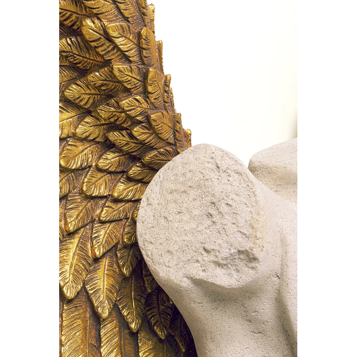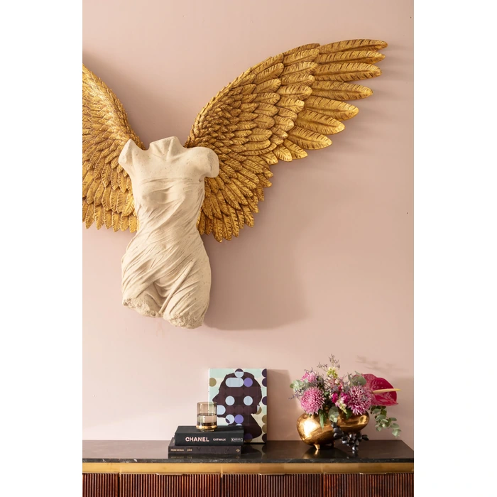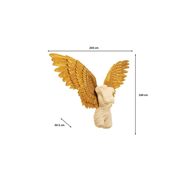 En imponerande väggskulptur med klassisk siluett och stora gyllene vingar som ger rummet ett konstnärligt fokus. Detaljrik, handgjord yta i tålig polyresin gör den till ett iögonfallande inslag i hall, vardagsrum eller offentlig miljö.