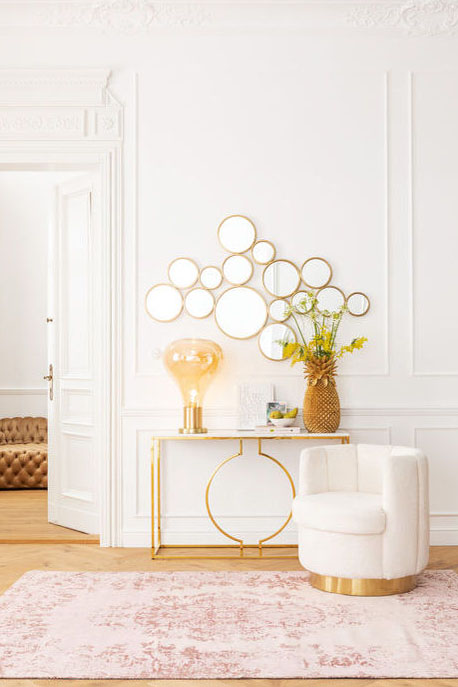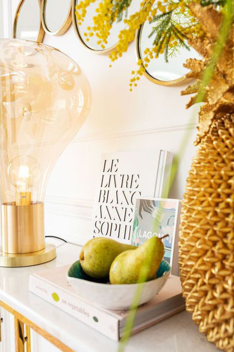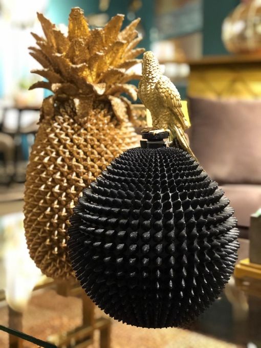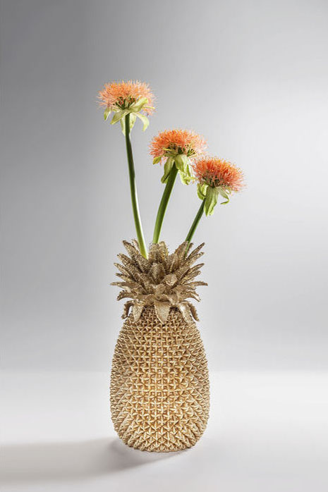 Det här är en ovanligt dekorativ guldvas i form av en stor ananas. Den är både vacker som vas med höga strån och skulpturala kvistar men också fin som inredningsdekor och blickfång precis som den är. Vasen är handgjord. Notera att denna vas ej är vattentålig!