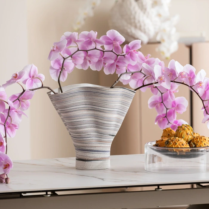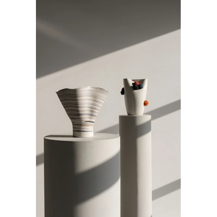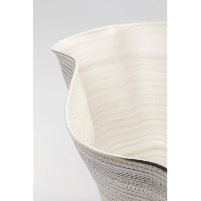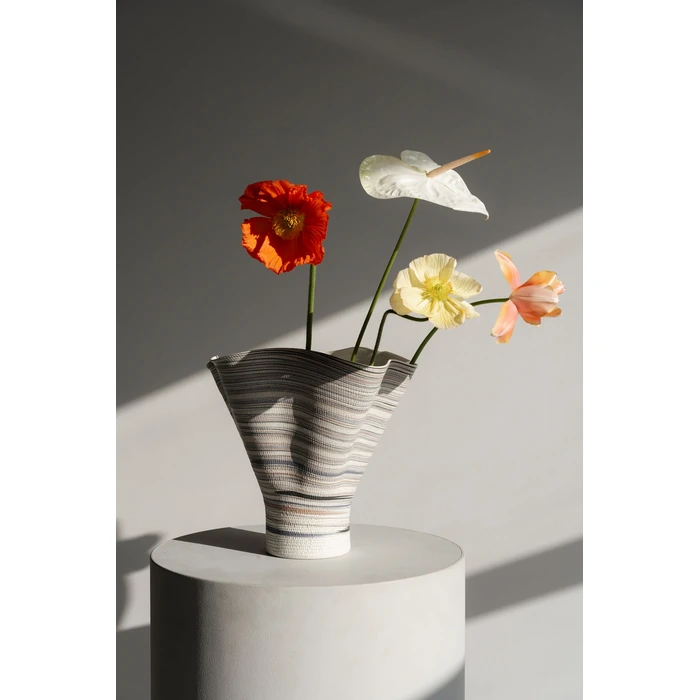Vas Borsa är en uttrycksfull keramisk vas med asymmetrisk siluett och en bred, organisk öppning som skapar ett konstnärligt intryck. De mjukt randiga färgskiftningarna ger liv och textur, vilket gör vasen till ett dekorativt blickfång även utan blommor.