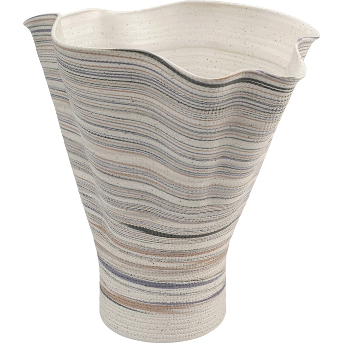 Keramisk vas med asymmetrisk form och randig yta i mjuka naturtoner.