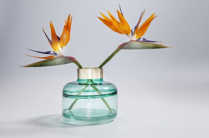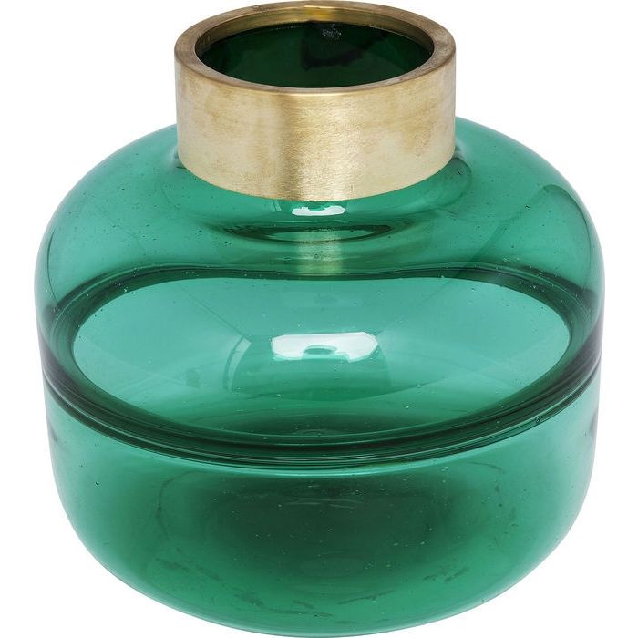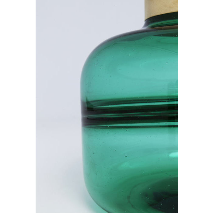 En dekorativ inredningsdetalj är denna stora vas i grönt glas med borstad mässingskant upptill. Varje vas är unik av munblåst glas. I serien finns även en blå glasvas samt skålar och fina karaffer.