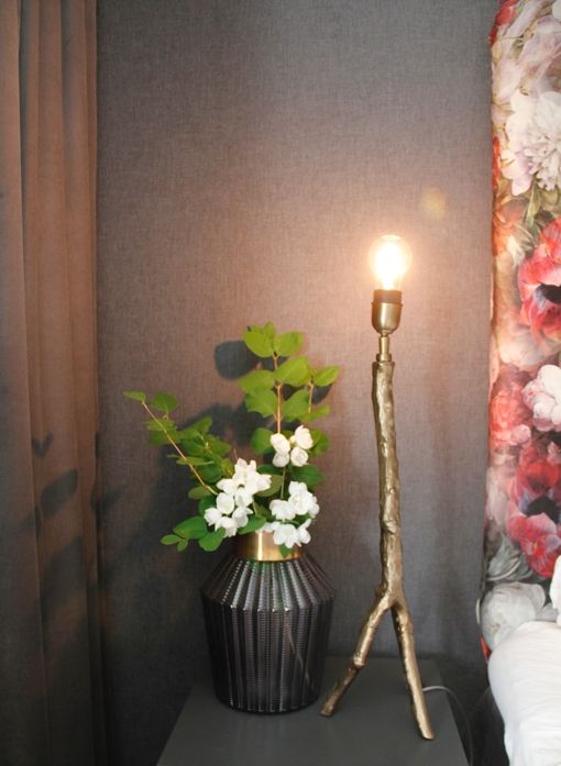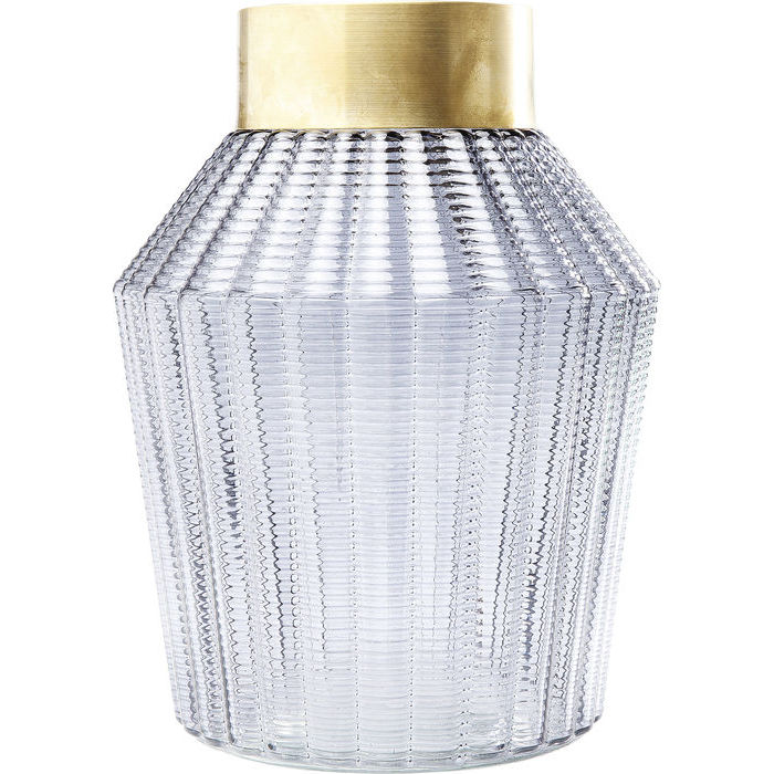 En stor, dekorativ vas i färgat glas med grå nyans och aningen inslag av lavendelblå ton. Vasen har ett fint reliefmönster och dekorativ mässingslist upptill. Material: Färgat glas, borstad mässing. Mått: höjd 30 x diameter 20,5 cm.