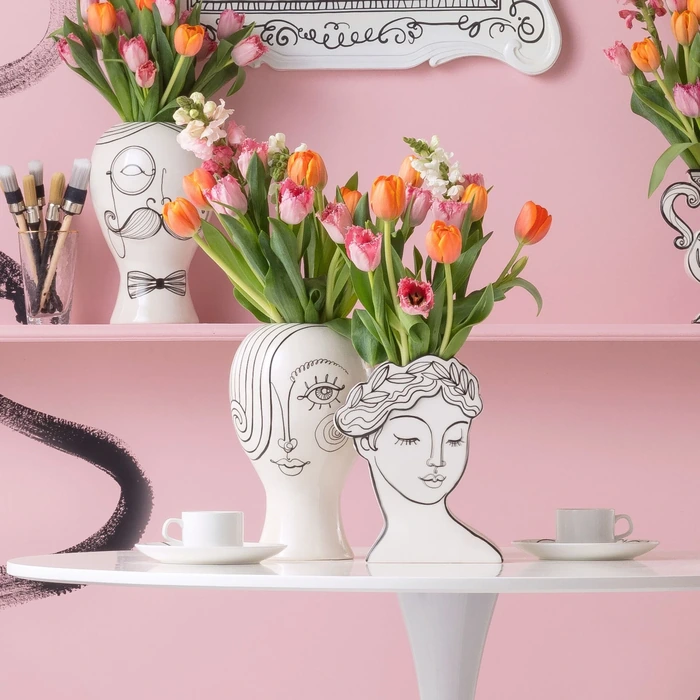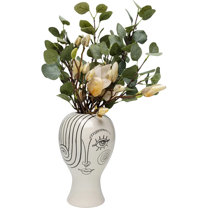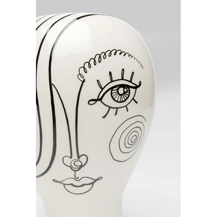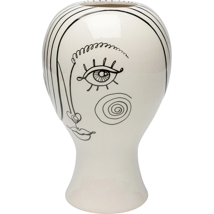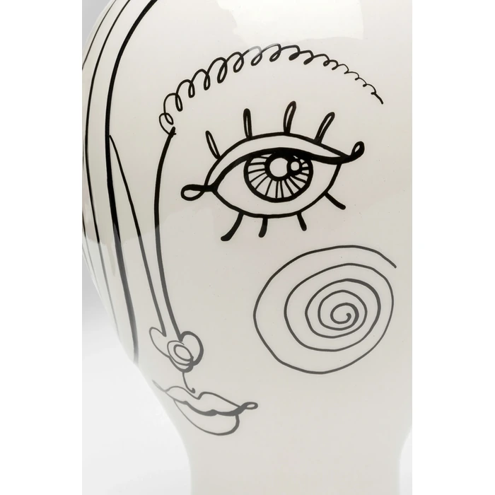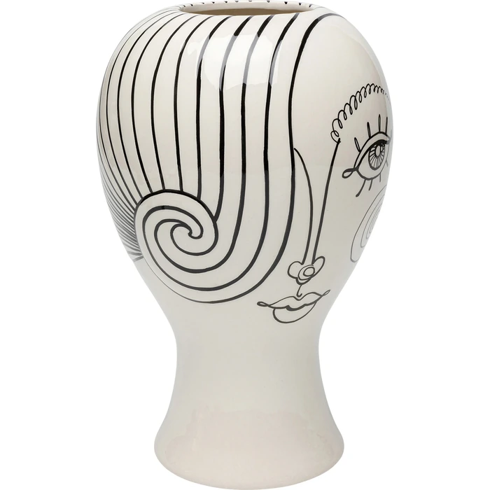 Vas Favola Lady är en uttrycksfull keramisk vas som kombinerar modern formgivning med ett konstnärligt ansiktsmotiv. Den glansiga vita ytan bryts elegant av handmålade svarta konturer som ger varje vas ett unikt uttryck och en personlig karaktär.