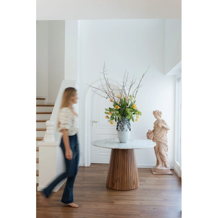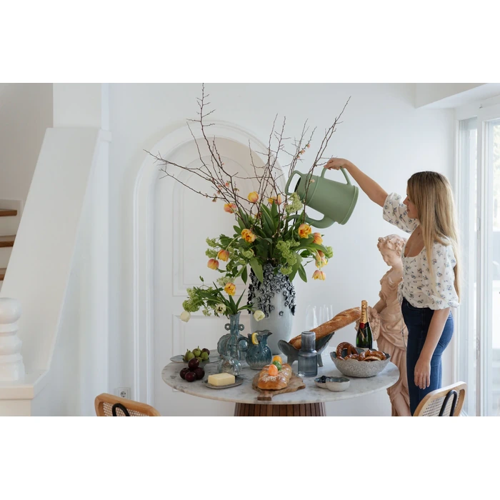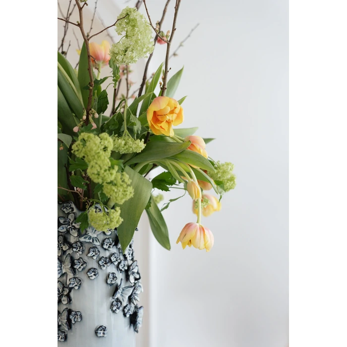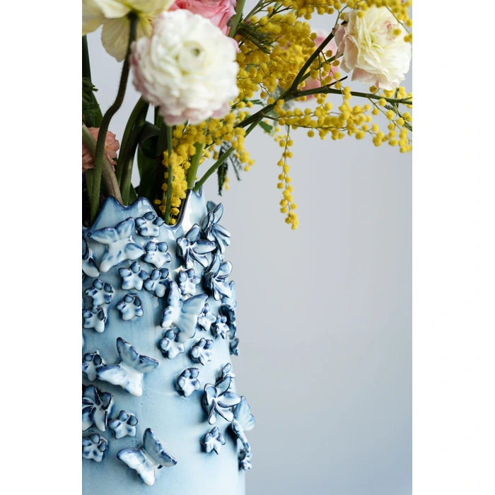 Vas Fjärilsrelief i ljusblått är en stämningshöjare som fungerar lika bra som skulptural solitär som för långa grenar och torkade buketter. Den organiska reliefen fångar ljuset och ger liv åt sideboard, fönster eller golvytor.