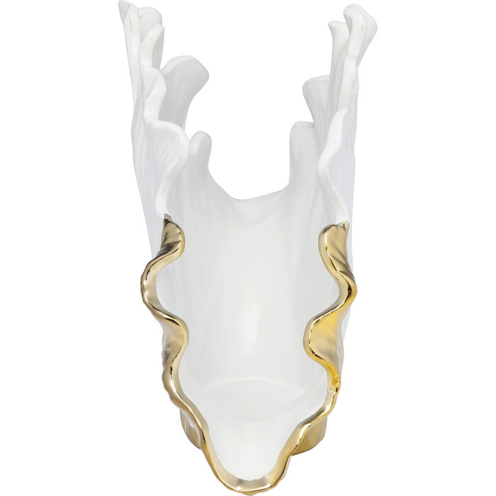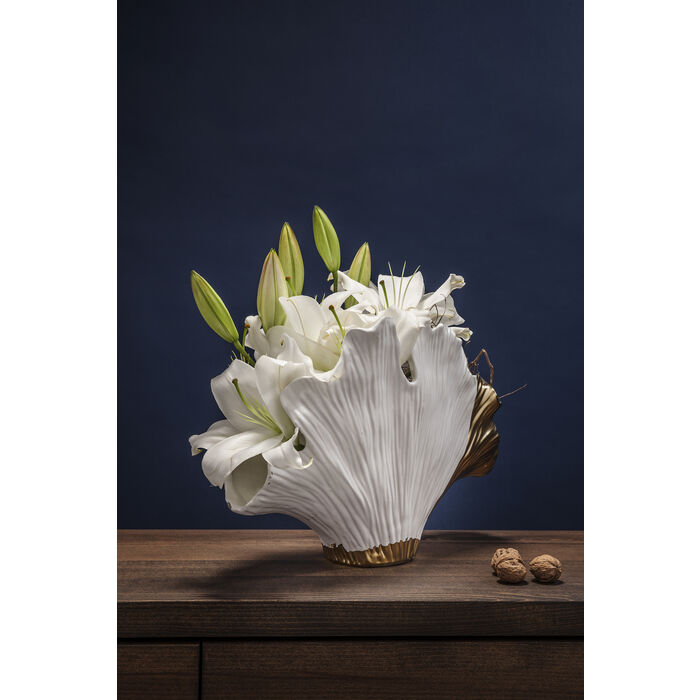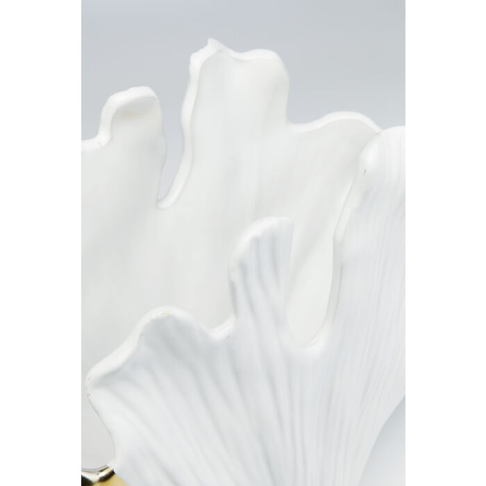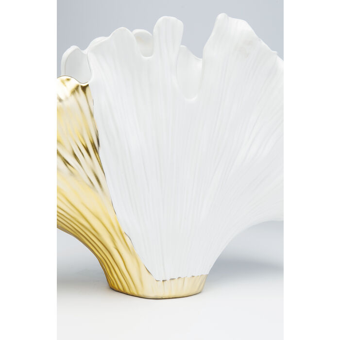 Konstnärlig keramikvas i form av ett ginkgoblad. Ginkgon sägs vara ett lyckoträd, de är också unikt vackra. Vit keramik med guldfärgade glaserade detaljer blir till en elegant blandning.