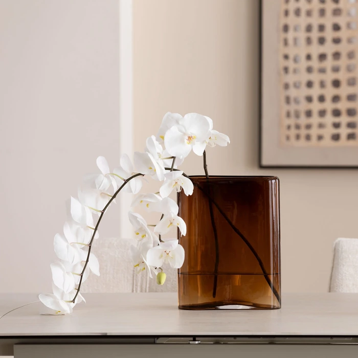 Vas Grazioso Brown 32 cm är en stilfull och dekorativ glasvas i en mjukt brun ton som skapar varma och eleganta accenter i hemmet. Den organiska och minimalistiska formen gör den till ett perfekt inslag i moderna och skandinaviska inredningsstilar där rena linjer och subtila färger står i fokus.