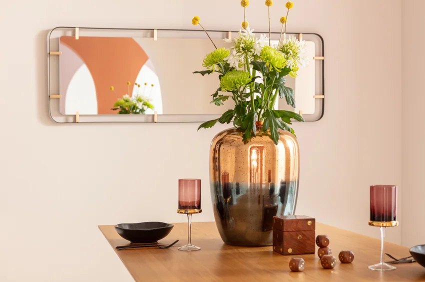 Spektakulär och stor vas i glansig kopparfärg i perfekt symbios med turkosa nyanser. Denna magnifika vas är är ett vackert tillskott i inredningen. Med en smidig och skinande yta i kopparfärg, fångar denna vas blicken omedelbart och sprider en känsla av raffinemang i rummet. Den turkosa nyansen som smyckar vaskroppens detaljer ger en livfull kontrast.