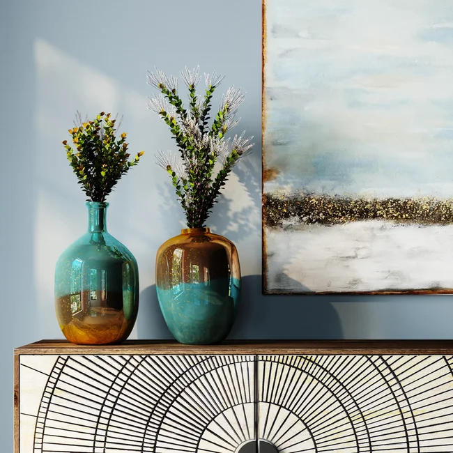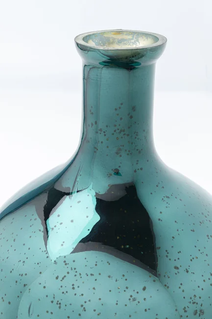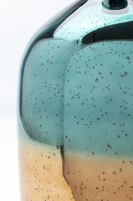 Spektakulär och stor vas i glansig kopparfärg i perfekt symbios med turkosa nyanser. Denna magnifika vas är är ett vackert tillskott i inredningen. Med en smidig och skinande yta i kopparfärg, fångar denna vas blicken omedelbart och sprider en känsla av raffinemang i rummet. Den turkosa nyansen som smyckar vaskroppens detaljer ger en livfull kontrast.