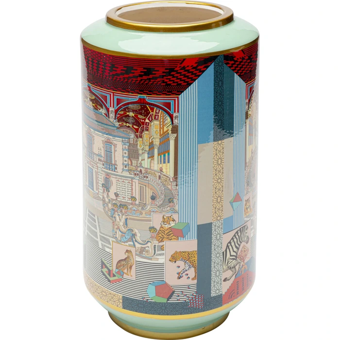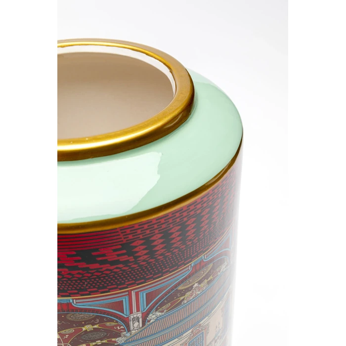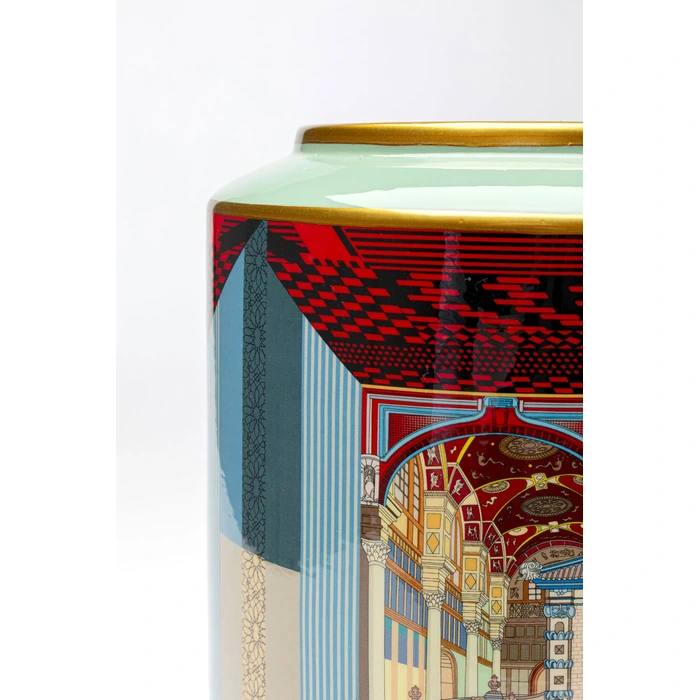 Färgstark porslinsvas med dekorativt palatsmotiv och gulddetaljer.