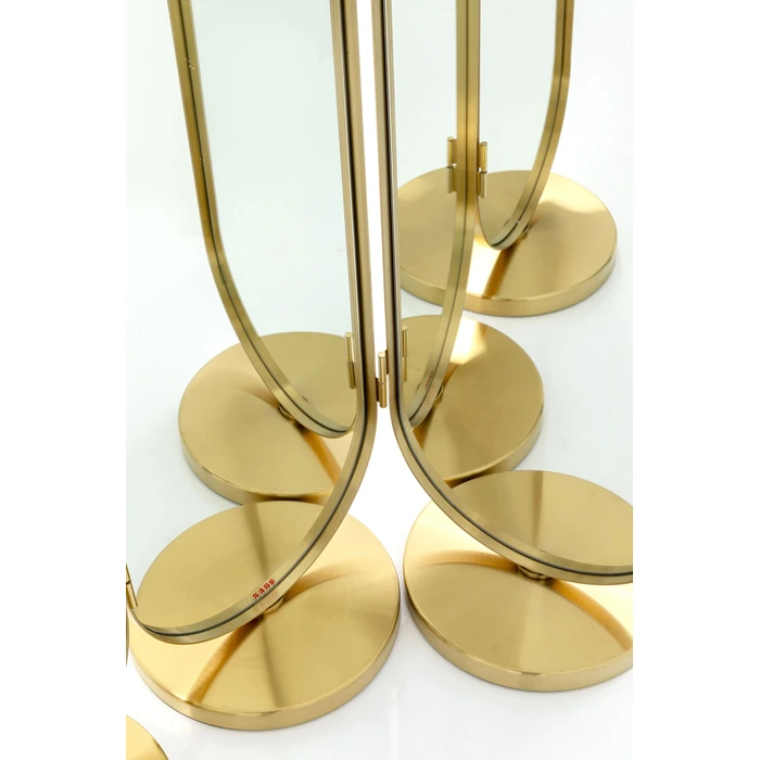 Vikskärm Curve är en exklusiv och elegant rumsavdelare som kombinerar spegelglas med en borstad mässingsfinish för ett uttryck inspirerat av 1920-talets glamour. Den ovala formen och de blanka ytorna reflekterar ljuset på ett sätt som skapar rymd och lyfter atmosfären i allt från sovrum till dressingroom och hall.