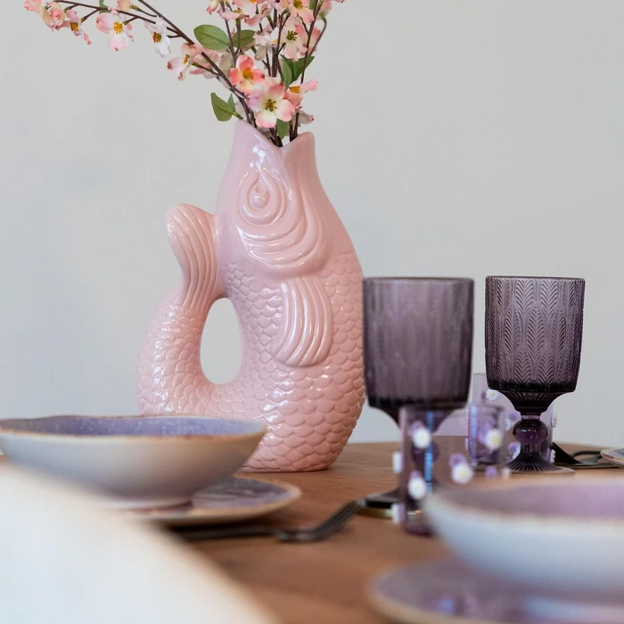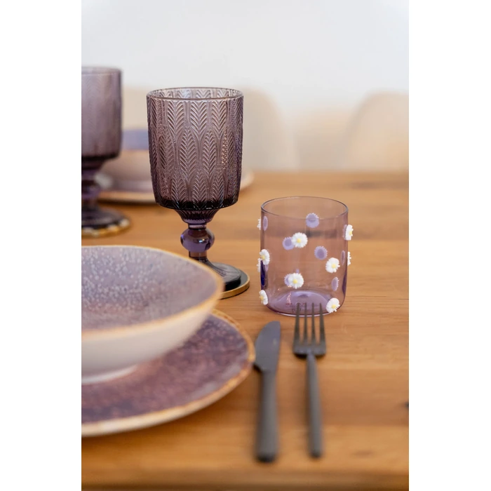 Den subtila lila färgtonen skapar en sofistikerad och dekorativ detalj på bordet och passar perfekt i både moderna och klassiska dukningar. Glaset kan kombineras med naturliga material som trä, keramik eller linne för en harmonisk och inbjudande bordsmiljö. Dessutom är glaset diskmaskinssäkert, vilket gör det praktiskt för både vardag och fest.