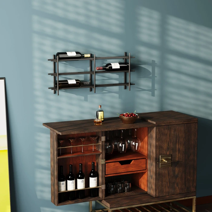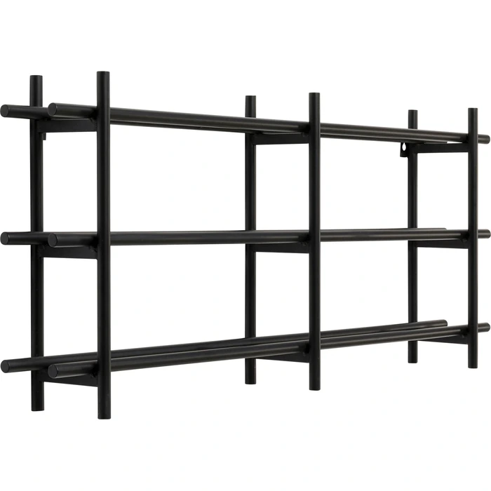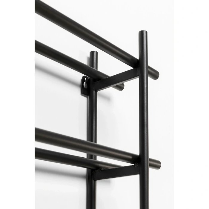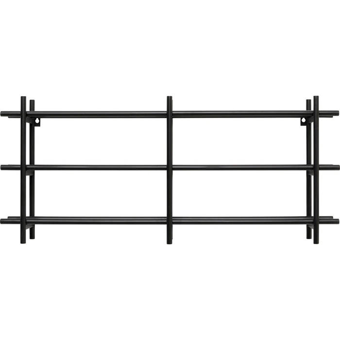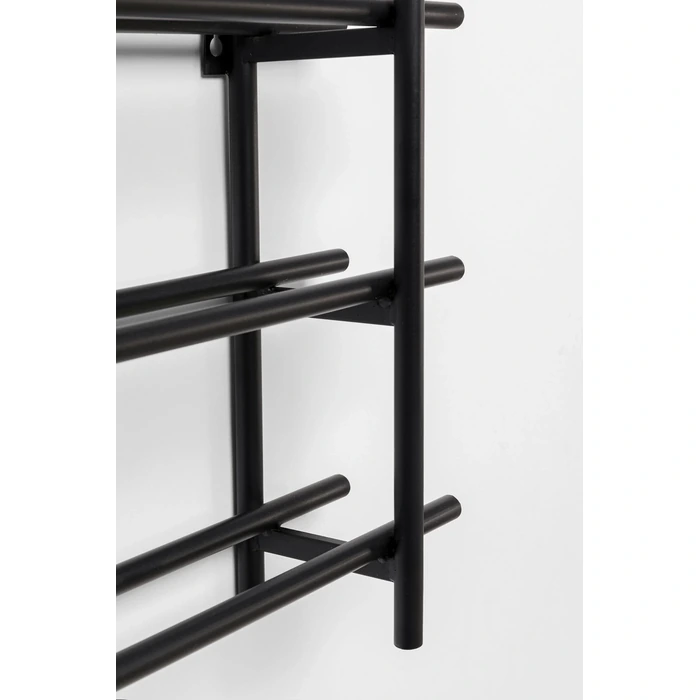 Stilrent vinställ för väggmontage i svart, pulverlackerat stål. Den öppna, grafiska formen visar etiketterna snyggt och gör det enkelt att förvara favoriterna nära till hands i kök, matsal eller hemmabar.