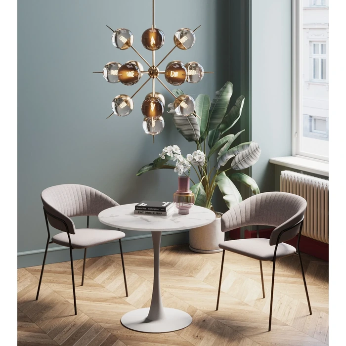Den tulpanformade foten i vitlackerat stål ger stabilitet och ett luftigt formspråk som passar perfekt i mindre kök, matplatser eller moderna matsalar. Bordet rymmer 2–4 personer och fungerar lika bra för frukost, arbete som sociala stunder. Enkel montering gör att bordet snabbt är redo att användas.