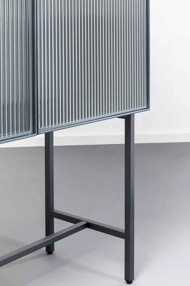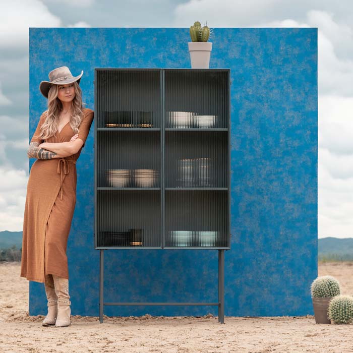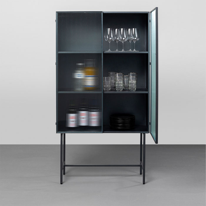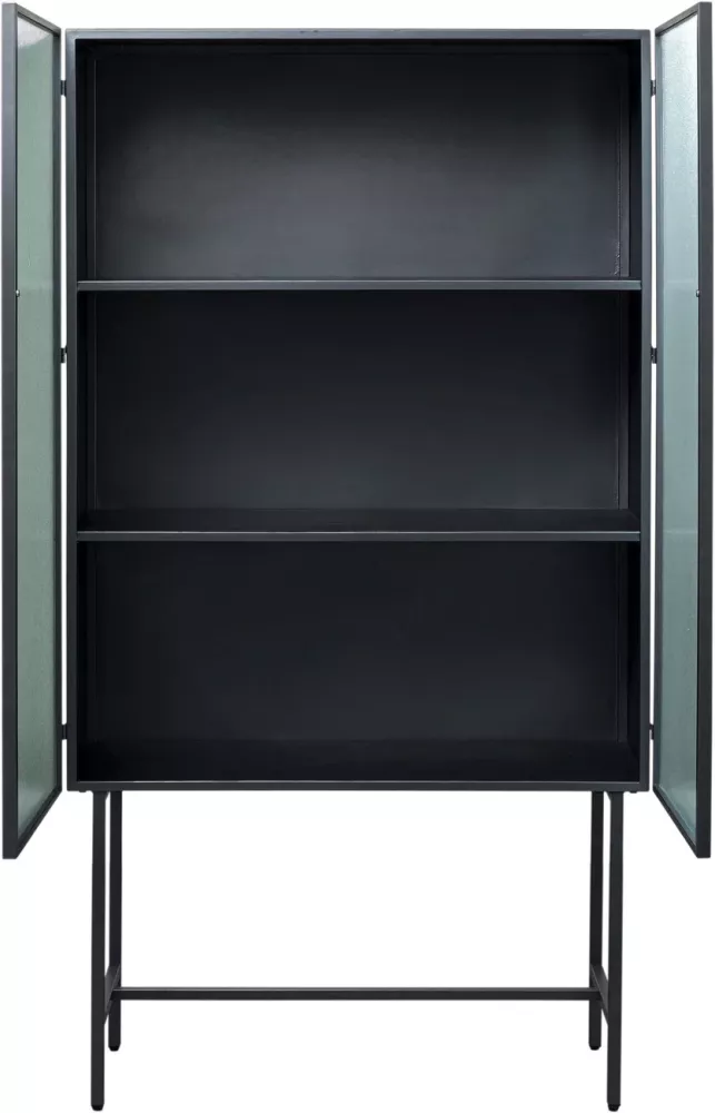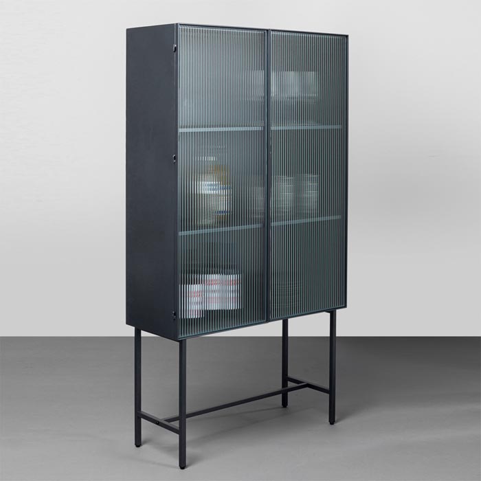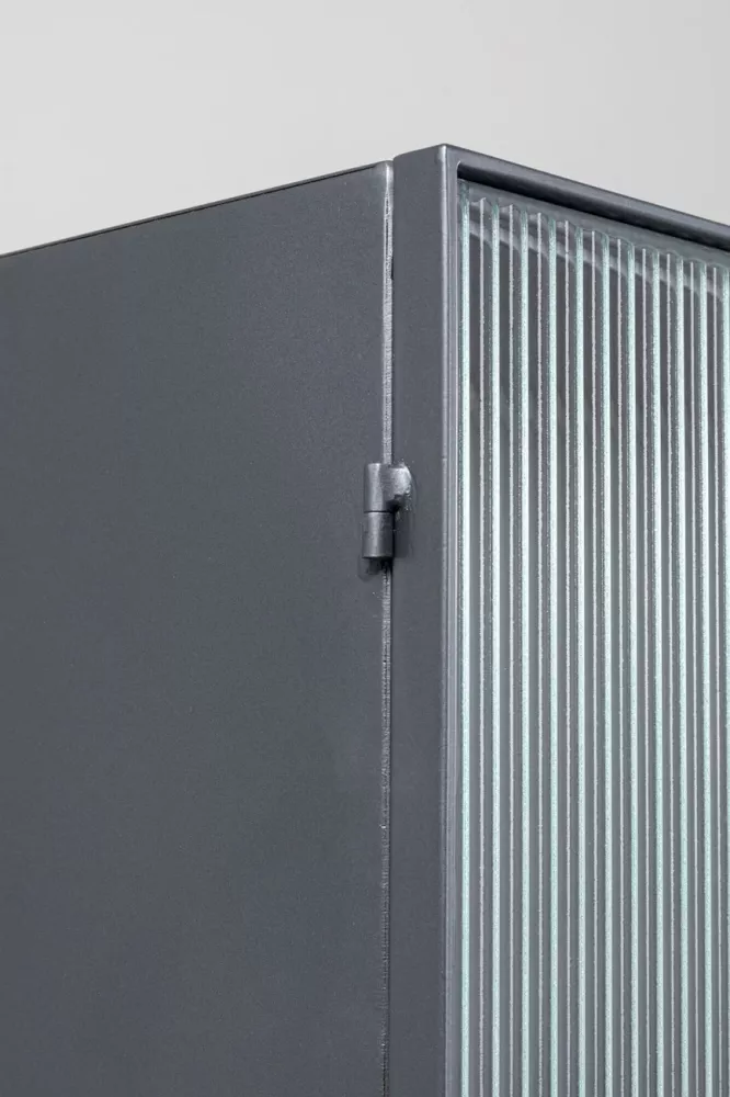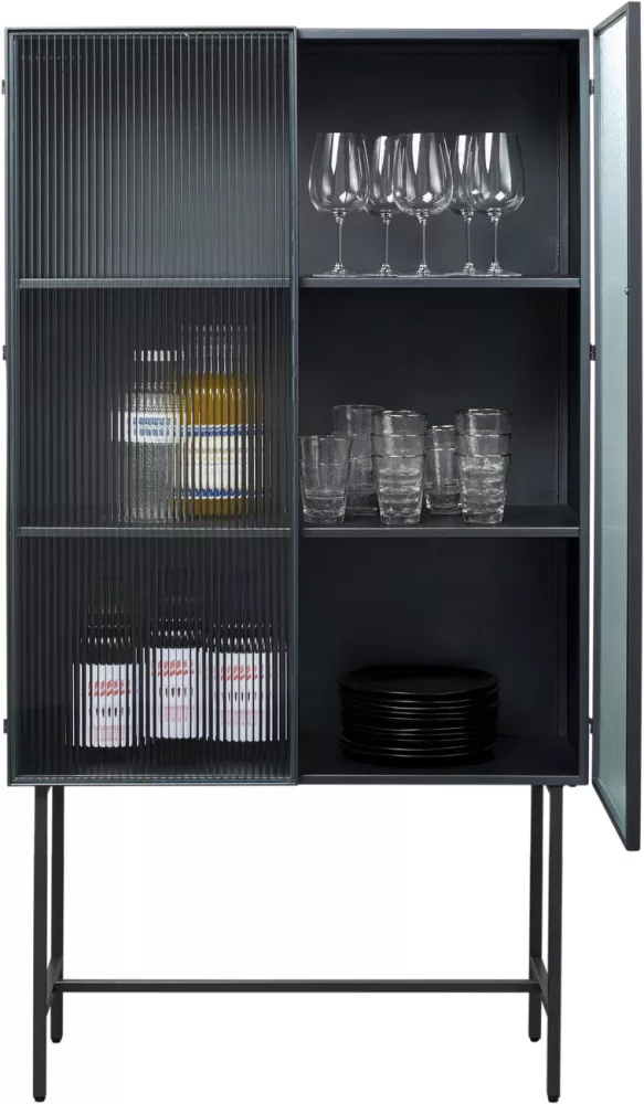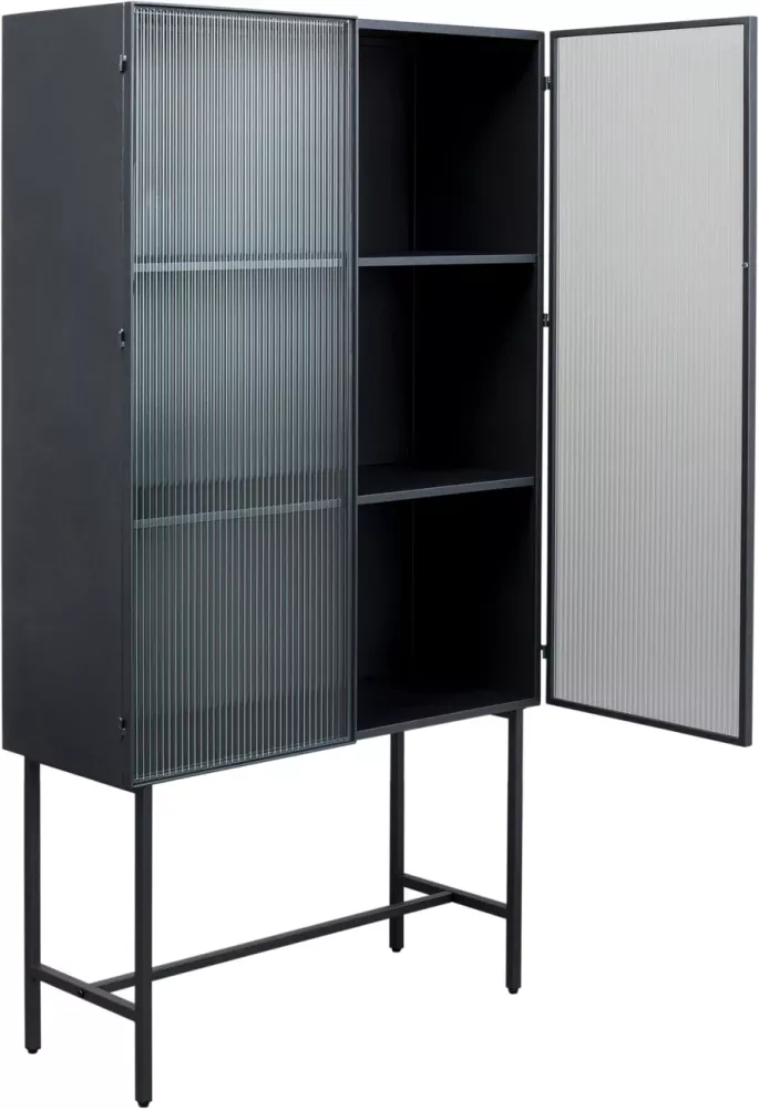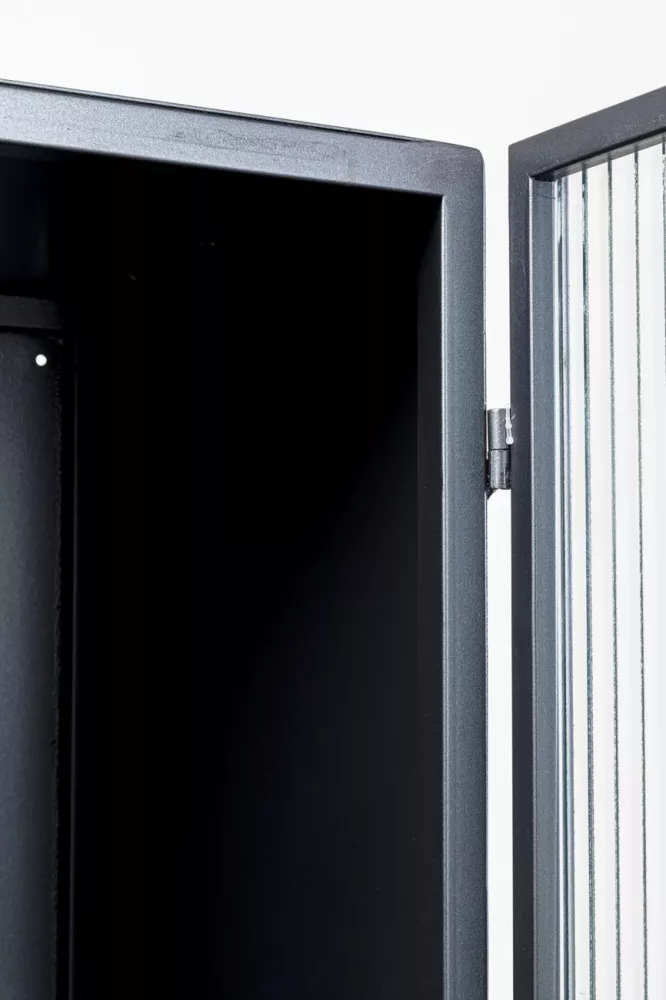 Vitrinskåp Industry Loft är en del av San Diego-serien – en modern tolkning av industriell design med lätt och stilren känsla. Skåpet är tillverkat i pulverlackerat svart stål med två dörrar i räfflat, härdat säkerhetsglas som ger möbeln ett luftigt och elegant uttryck. De fasta hyllplanen erbjuder stabil förvaring av glas, porslin eller dekorativa objekt. Push-to-open-funktionen förstärker den minimalistiska estetiken. Perfekt i vardagsrum, matsal eller kök för dig som söker funktion i kombination med design.