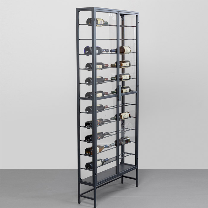 Stilrent vitrinskåp i stål med plats för 22 vinflaskor. Glasad runtom – perfekt för dig som vill förvara och visa upp med stil.